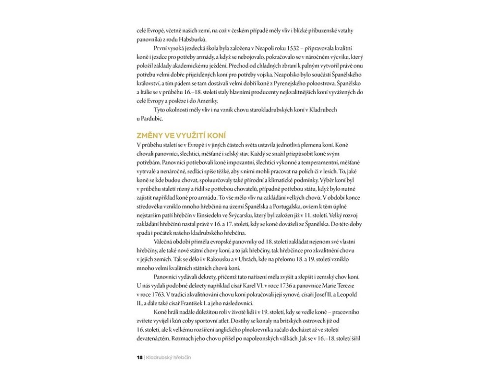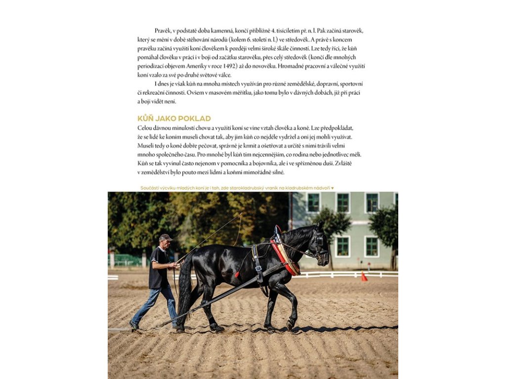 Kniha vypráví o kořenech původu koní a hřebčínů a také o místním názvu Kladruby. Provede nás nejenom dnem, ale i celým rokem v kladrubském hřebčíně a sdělí, jak se ona nádherná krajina luk a pastvin, alejí a remízků, řeky a zavlažovacích struh dostala pod ochranná křídla UNESCO.