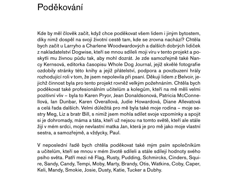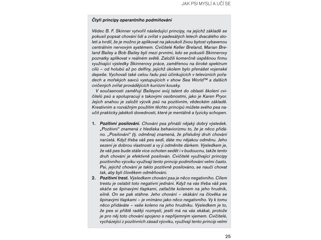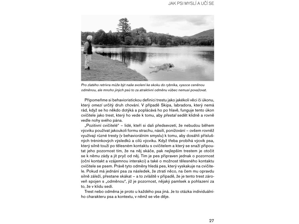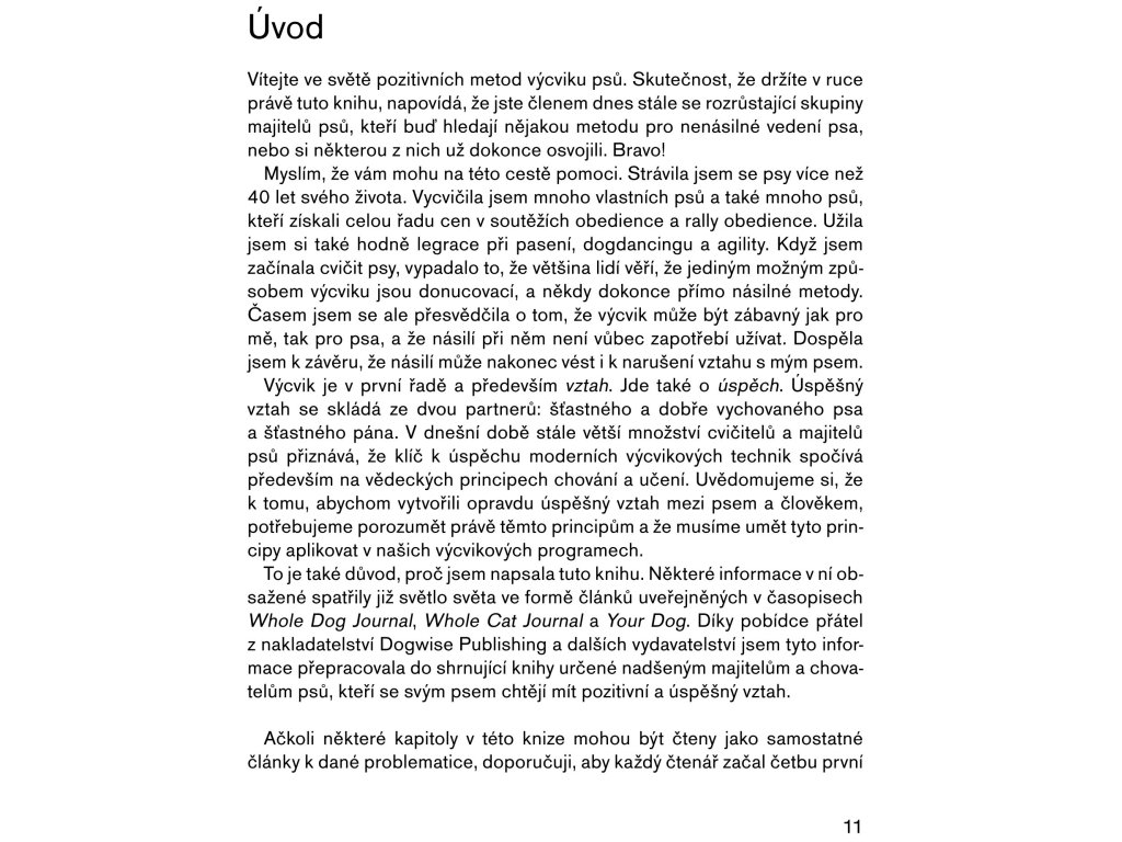 Vítejte ve světě pozitivních metod výcviku psů. Kniha Pozitivní metody výchovy psa je určena všem majitelům psů, kteří hledají nějakou metodu pro nenásilné vedení psa – nebo si některou z nich už dokonce osvojili. Podle Pat B. Millerové má být výsledkem výcviku psa především kvalitní vztah, a ten se může rozvinout jenom mezi šťastným a dobře vychovaným psem a šťastným pánem. K tomu, abychom takový vztah vytvořili, potřebujeme porozumět principům chování a učení u psů a následně musíme umět tyto principy aplikovat v našem výcviku. Je to snazší, než se na první pohled zdá, a odměnou vám bude vyrovnaný a poslušný pes, jehož jste vycvičili bez křiku a nervů. A to za to přece stojí, nebo ne? Pat B. Millerová strávila se psy více než 40 let života. Vycvičila mnoho vlastních psů a také mnoho psů, kteří získali celou řadu cen v soutěžích obedience a rally obedience. Vyjma toho si se svými psy užila spoustu legrace při pasení, dogdancingu a agility. Řadu let působila jako prezidentka největšího amerického sdružení profesionálních trenérů psů Association of Pet Dog Trainers. Její čtyři psi jsou nalezenci těch nejrůznějších plemen a velikostí.