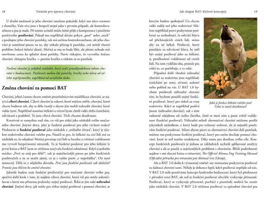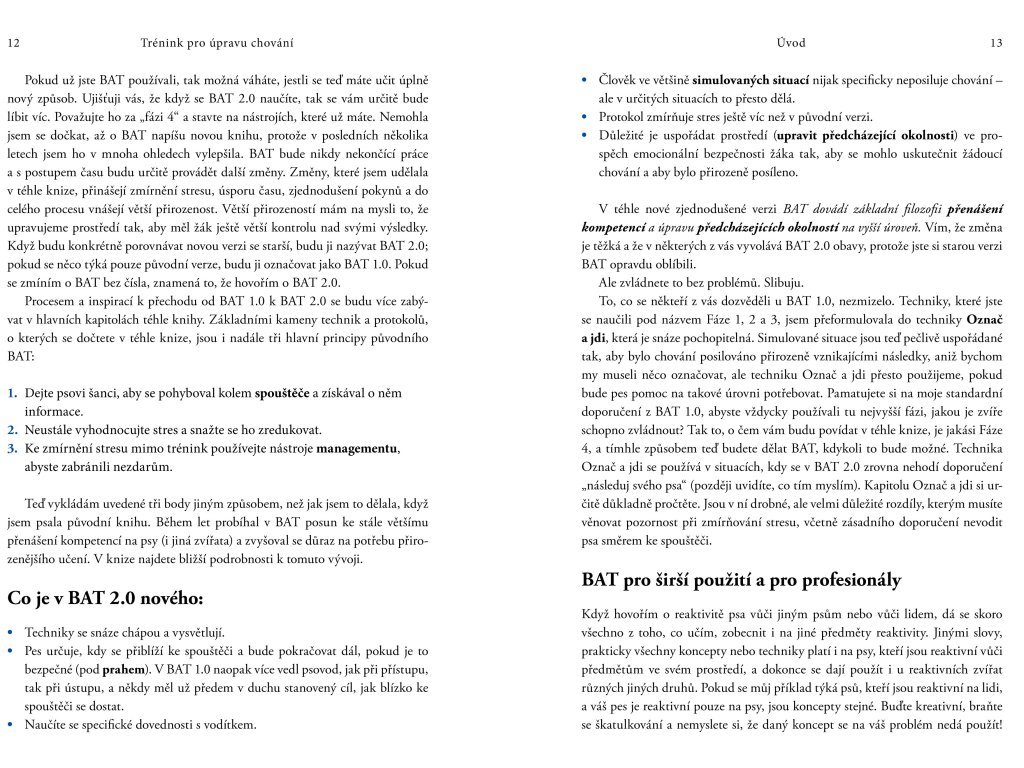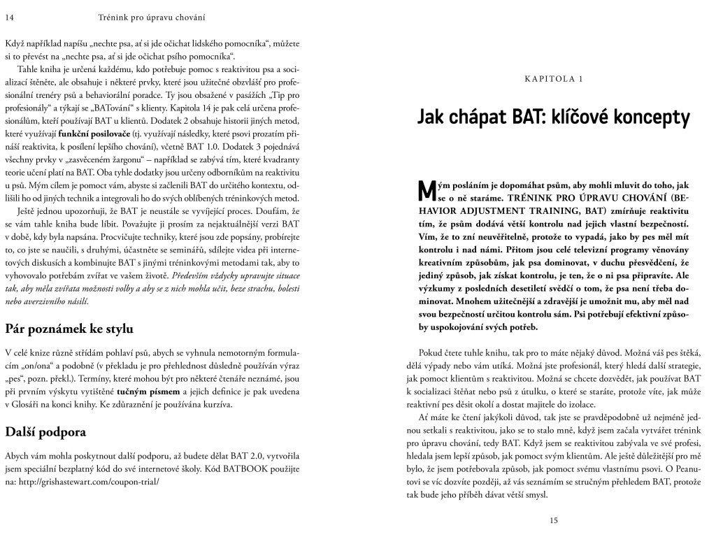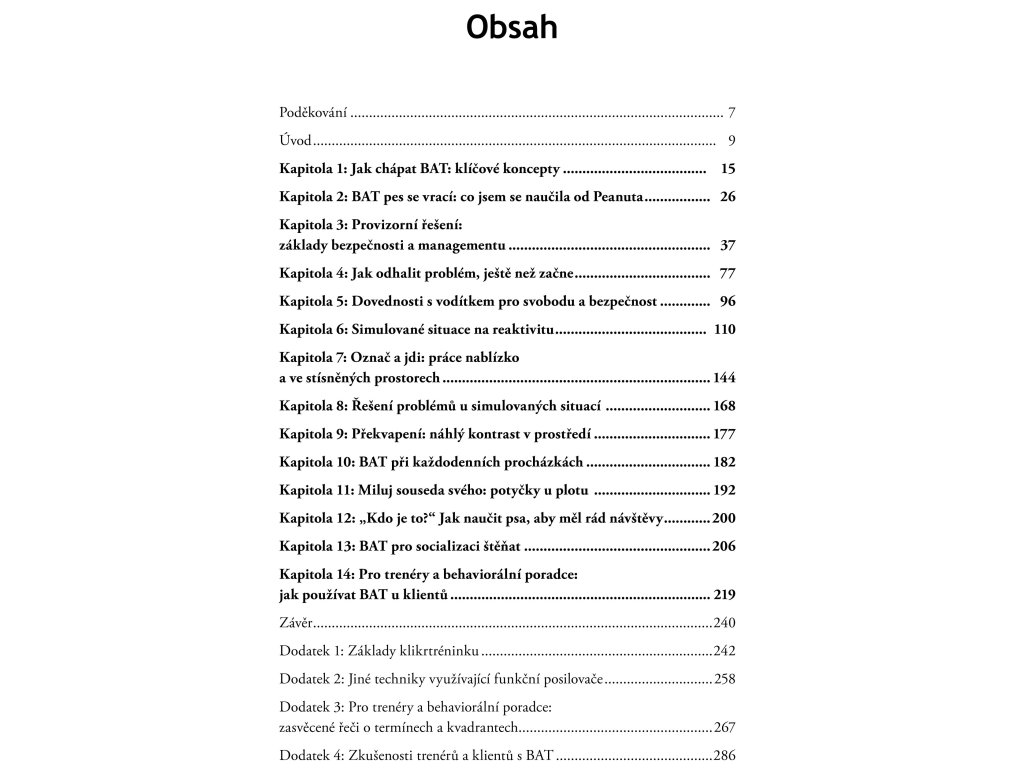 Výcvikovou metodu BAT (Behavioral Adjustment Training) vyvinula trenérka Grisha Stewartová přes více než 10 lety a od té doby ji s úspěchem používá. A nejen to – v průběhu let ji neustále vylepšovala a odlaďovala, což vedlo jak k lepším výsledkům, tak k novému, aktualizovanému vydání její knihy, kterou nyní přinášíme českým čtenářům.