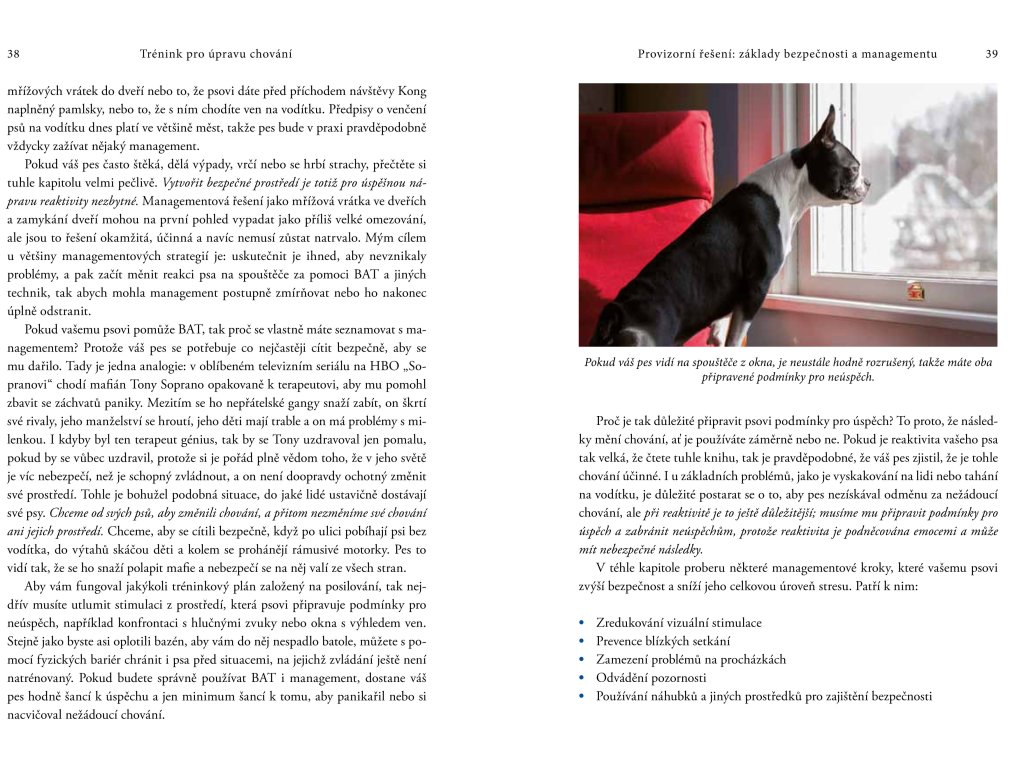 Knihu Trénink pro úpravu chování si musí přečíst každý, kdo pracuje s nadměrně reaktivními psy. Postupy v ní popsané již po léta usnadňují život psům po celém světě. Srozumitelnost, praktičnost a důraz na to, jak to všechno vnímá pes, to jsou hlavní důvody, proč jsou tyto výcvikové metody tak úspěšné u psů, kteří ve společnosti jiných psů nebo lidí zažívají frustraci nebo úzkost. Tuto knihu doporučuji každému, kdo si láme hlavu s reaktivním psem nebo chce svému psímu společníkovi lépe porozumět.